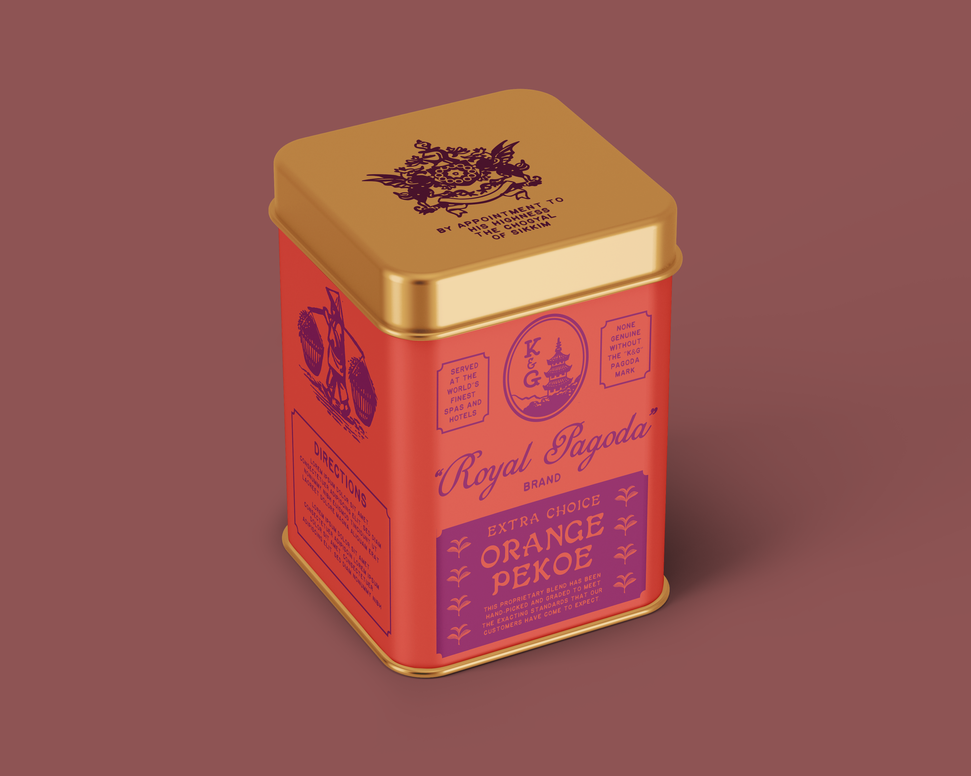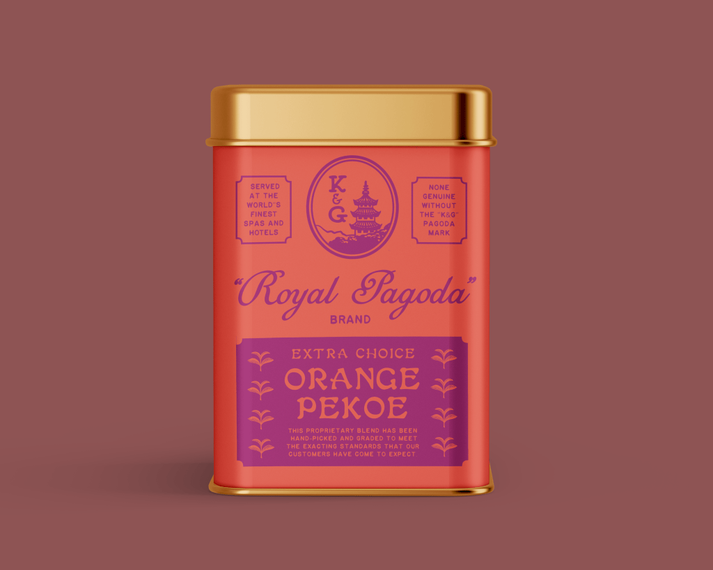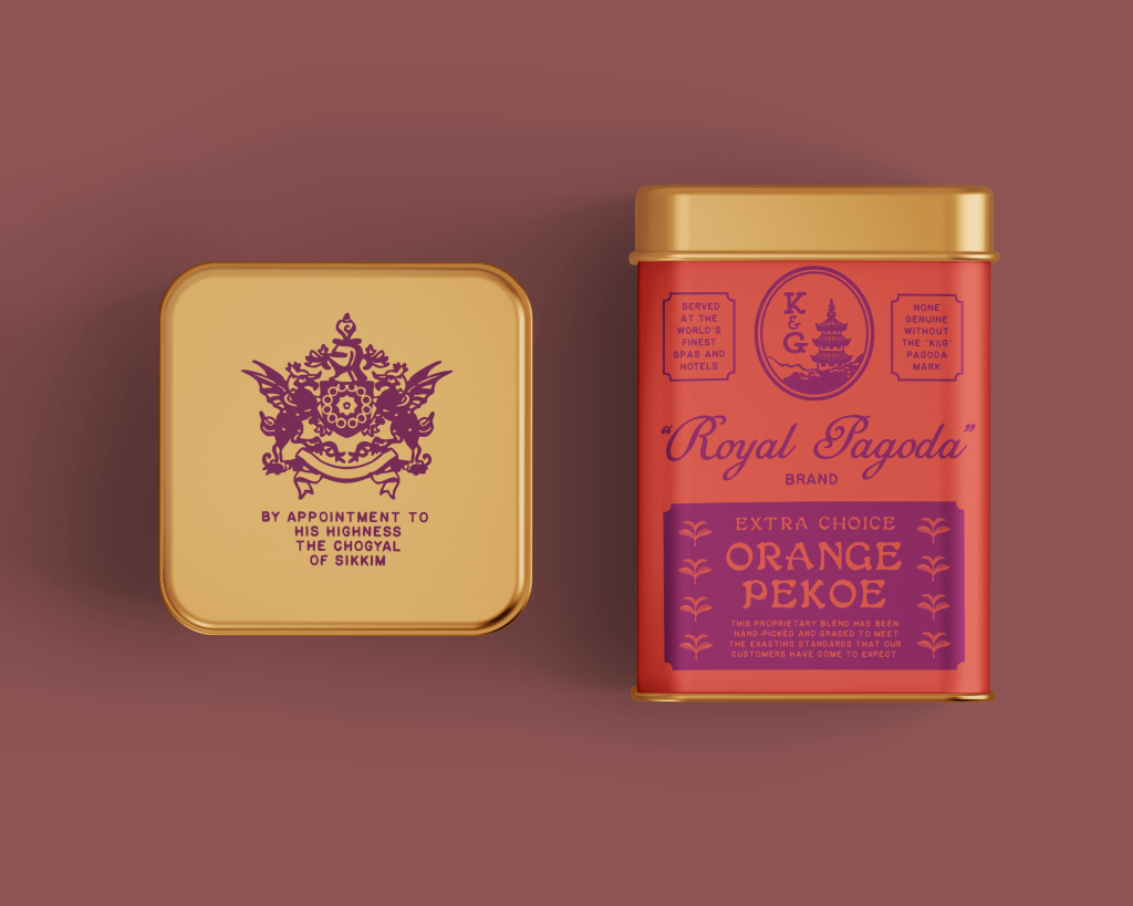 I made the brand name and the company name separate, which is an approach I sometimes see on old school Chinese medicine brands. “Royal Pagoda” is deliberately intended to sound like either a poor translation, or a clunky attempt to present itself as an exotic, “high-end” product to a gullible mid-century western consumers. In the spirit of Angostura Bitters, I also turned the rule of “Show, don’t tell,” on its head. This is a brand with a lot to say about itself all over its packaging! As an additional extra, I created an emblem of a fictional royal warrant from the (formerly very real) Princely State of Sikkim to grace the lid. A royal warrant is an official seal of approval from a royal family to any company that supplies them with goods or services that are deemed to be of exceptional quality. Did the Prince of Sikkim actually hand out such warrants? Since the statelet was absorbed into India in 1975, there’s no way of knowing for sure!