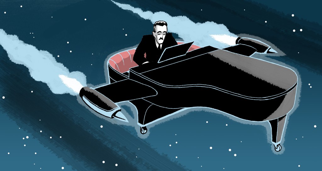 Another, more dancer-specific item that I decided to create was a shoe bag. This is a classic accessory for most dancers, and an ideal canvas for some of my concepts. I decided to rework an older design, using renderings of vintage speedball style lettering for the typography. Longtime follows of my website may well recognize the original illustration from a few years back; the pianist is Rodolfo “Manos Brujos” Biagi, a famous musician and composer from the golden age of tango. “Esperame in Cielo” refers to one of his classic later compositions from the 1950’s, hence the space age / sputnik theme.