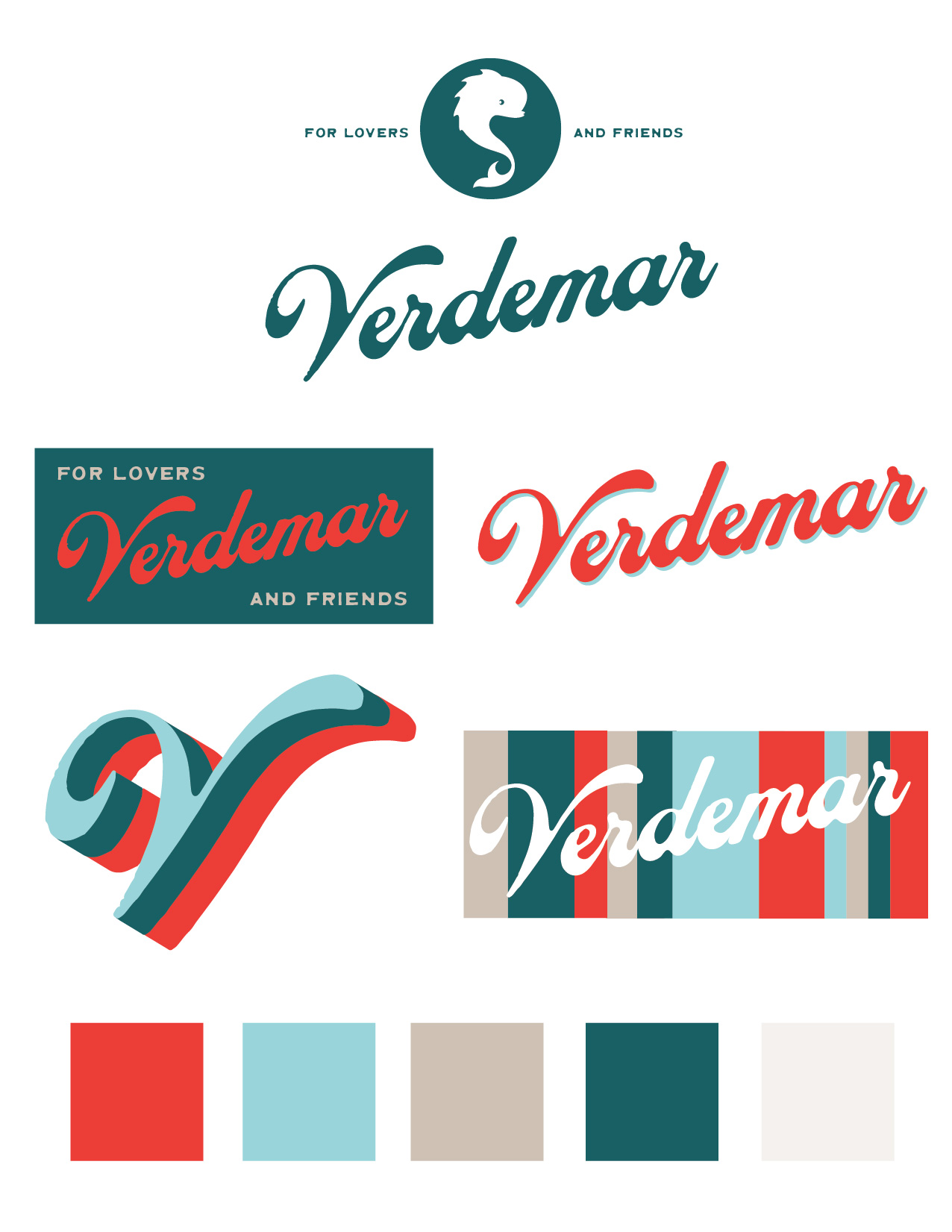 I decided on a fairly loose style for maximum adaptability. The main elements: four colors, plus a fifth variant, all originally designed as an expansion of my current brand colors, but never really used. The irregular “barcode” stripe pattern, the title itself, written in a classic script font courtesy of Brandon Nickerson, one of my favorite font designers. The primary tagline, “For Lovers and Friends,” and of course the signature dolphin roundel. The main focus is allowing the branding to be highly modular and variable. Within the constraints I’ve created, I’ve given myself leeway to use any of the elements with or without each other, in different ways and with occasional variations, such as a colored drop shadow.